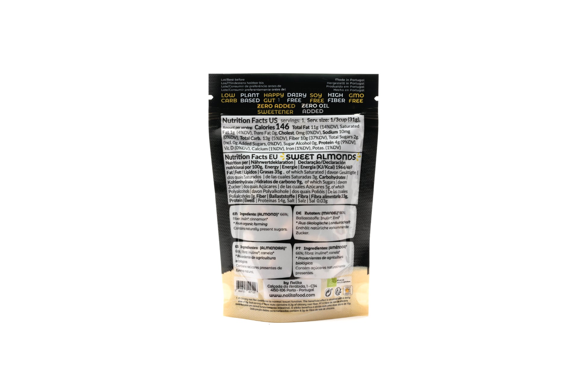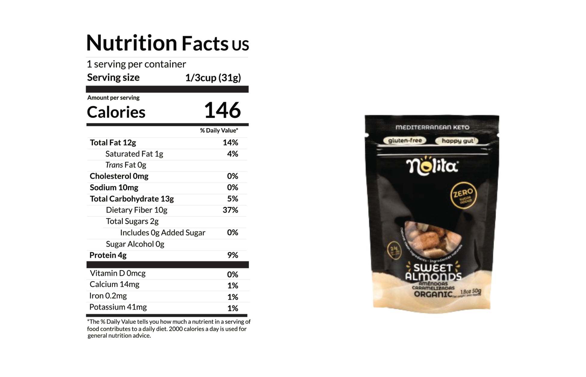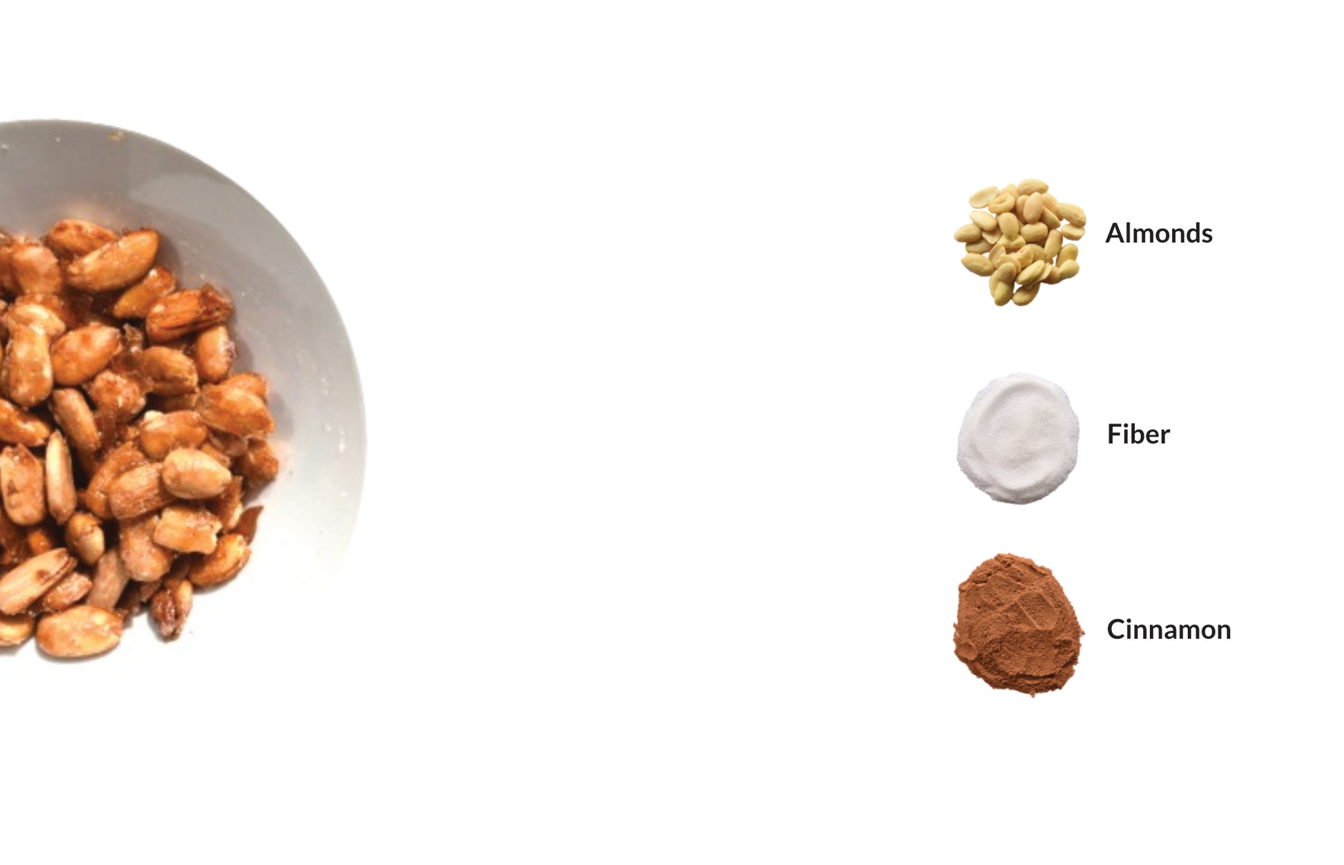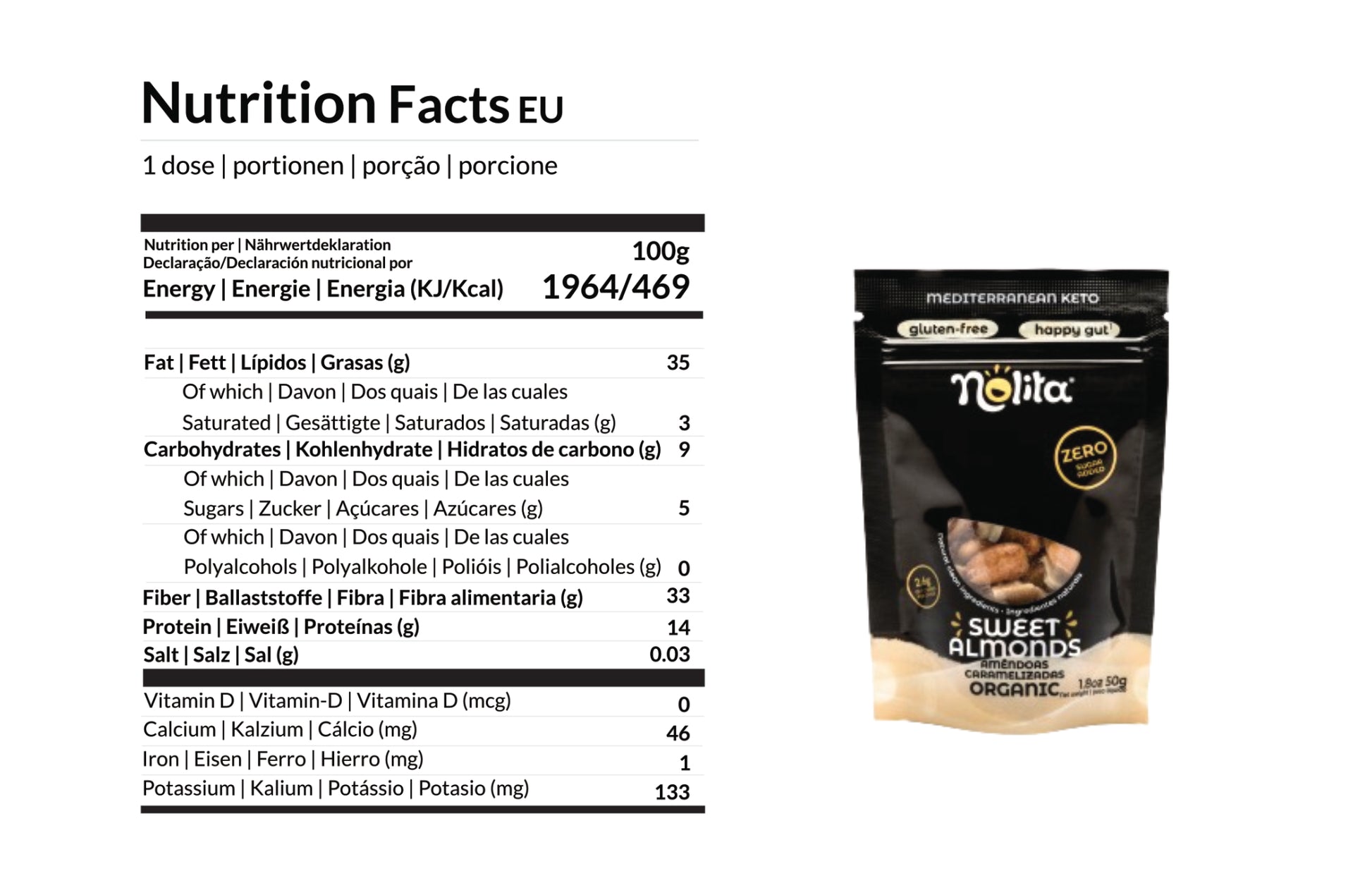 Almonds caramelized with a twist of cinnamon. Zero added sugars! 0.5oz | 14g of protein per 3.5oz | 100g. High fiber. Organic & GMO free. Keto & Low Carb | only 0.09oz | 2.6g net carbs per dose. Grains-free. Oils free. Promotes a happy gut.