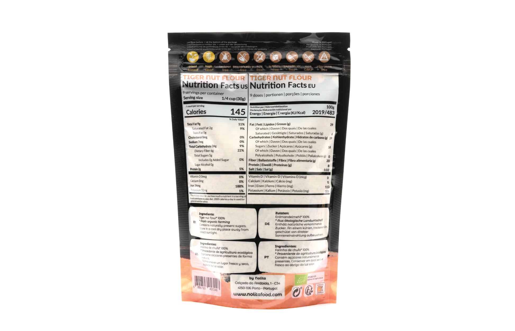 Introducing our nutrient-rich and delicious tiger nut flour! Packed with a variety of health benefits. High fiber: 0,71oz | 20g per 3.5oz | 100g, it's the sweetest keto flour: 0,63oz | 18g net carbs per dose. Gluten-free. Vegan. Organic & GMO free. Grains-free.